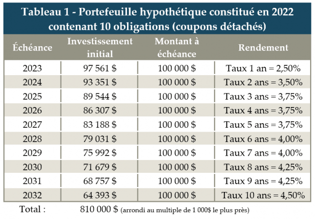 Supposons qu’un investisseur sélectionne dix obligations à coupons détachés[i] dont la valeur à l’échéance de chacune est de 100 000$ (tableau 1). Le coût d’achat de ce portefeuille est d’environ 810 000$. À chaque année, une tranche arrivera à échéance et, systématiquement, l’investisseur réinvestira le montant à maturité (100 000$) pour un nouveau terme de 10 ans.