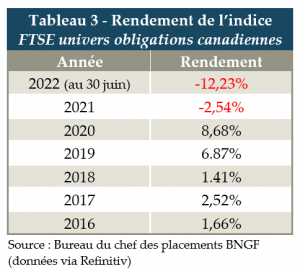 AAu cours des 6 premiers mois de 2022, le prix des obligations a chuté de façon marquée (tableau 3), ce qui contribue à déprécier la valeur marchande indiquée sur le relevé de portefeuille des investisseurs détenant des obligations.