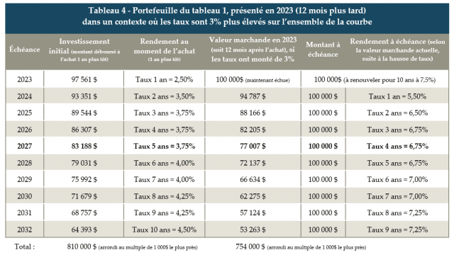 D’abord, il est bon de savoir qu’un coup le portefeuille déjà déprécié (ex : baisse de 810 000$ à 754 000$ pour reprendre l’exemple des tableaux 1 et 2), les 10 obligations offriront subséquemment des taux plus élevés que ceux obtenus à la construction du portefeuille un an plus tôt. Le tableau 4 affiche le détail du portefeuille un an plus tard (en 2023) dans l’hypothèse où les taux ont progressé de 3% en 12 mois. Une première tranche est alors échue et sera renouvelée à 7.5% pour 10 ans. Mais ce n’est pas la seule tranche qui progressera à un meilleur taux. Prenons l’exemple de l’obligation dont l’échéance est en 2027 (tableau 4). À l’origine, elle fut acquise, en 2022, pour 83 188$ (rendement annuel à l’achat était 3.75%). Douze mois plus tard, son prix a baissé à 77 007$ en raison de la hausse des taux. Mais les intérêts et le capital sont toujours garantis à l’échéance. En la conservant jusqu’à l’échéance, sa valeur passera de 77 007$ à 100 000$ en 4 ans, ce qui représente un rendement de 6.75% par année en moyenne. L’investisseur qui, déjà, a subi la chute du prix des obligations, n’aura pas, de surcroît, à attendre au renouvellement de son placement pour obtenir des taux plus élevés. Le « dédommagement » commence dès maintenant, ce qui constitue au moins une consolation.