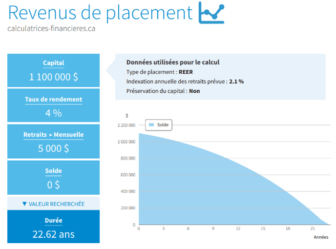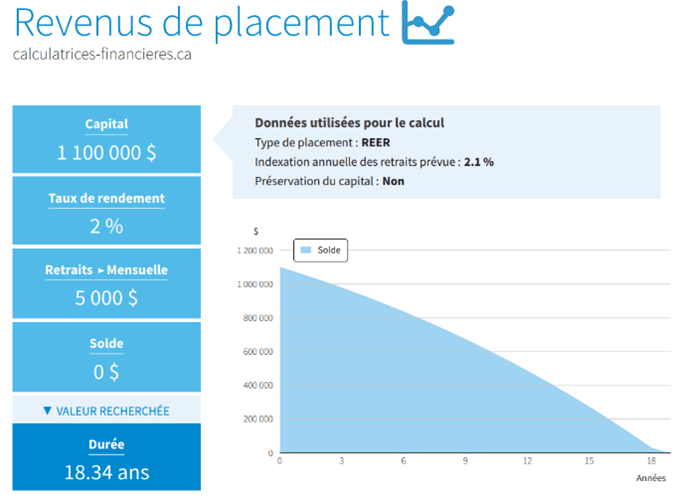 Voici 2 simulations de bases, à l’aide d’une calculatrice financière, pour comparer la durée d’un placement de 1 100 000$, avec des retraits indexés de 5 000$ brut par mois, selon le rendement projeté :