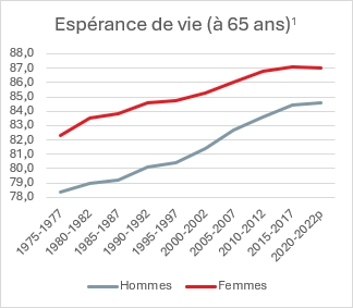 [1] Source : Espérance de vie à la naissance et à 65 ans selon le sexe, Québec, 1975-1977 à 2022 (quebec.ca)