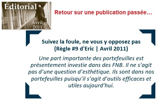 On entend souvent parler des fonds négociés en bourse (FNB) dans les médias, que ce soit via des publicités ou des propos financiers. Tendance de l’heure? Pas du tout, puisque les FNB sont tout, sauf nouveaux… J’en recommande à mes clients depuis bientôt 25 ans! L’économie de frais de gestion, sur une aussi longue période, a ainsi eu un impact considérable sur le rendement composé des comptes que nous gérons et l’atteinte des objectifs financiers de nos clients. La popularité des FNB s’explique facilement puisqu’ils offrent une diversification instantanée ainsi qu’une grande liquidité, ce qui permet aux investisseurs un ajustement rapide de leur portefeuille. Mais derrière cette simplicité apparente, la gestion d’un portefeuille optimal demande bien plus qu’un simple achat d’un FNB indiciel. Révisons aujourd’hui ce qui m’intéresse autant de ces produits et les raisons pour lesquelles ils comptent pour 60 à 100% du portefeuille de la majeure partie de ma clientèle.